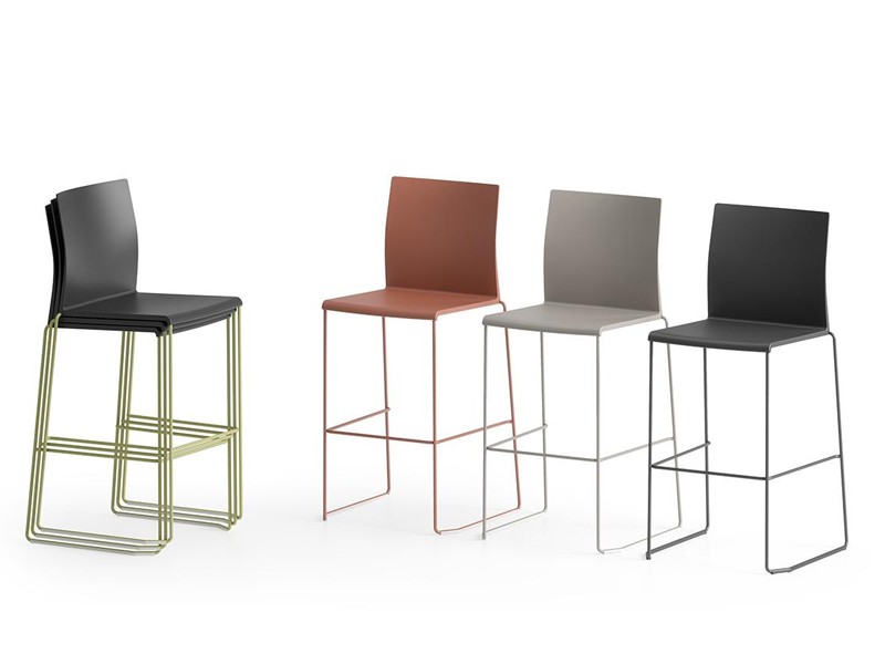 • The Artesia stool, featuring a stackable design, is crafted from a technopolymer shell and a metal rod frame, both available in vibrant, trendy colors.