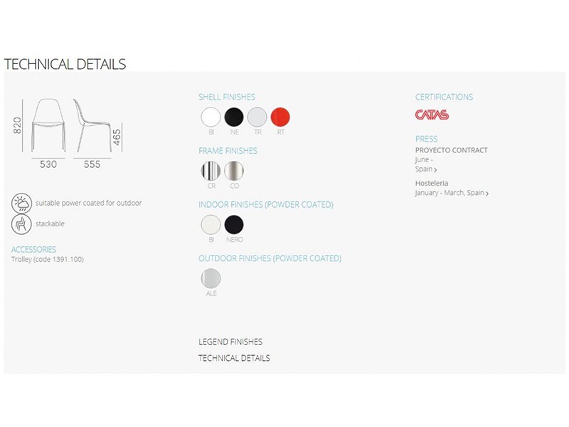 - legs in chromed, mat chromed, white or black powder coated and silver powder coated for outdoor.