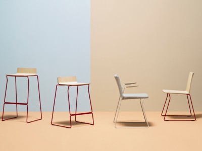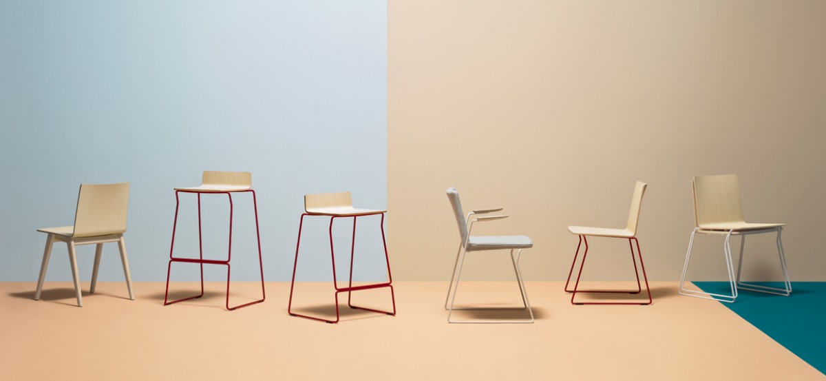 • Osaka Metal armchair, with ash plywood shell upholstered in fabric or leather combined with steel tube legs, features the functionality of the collection.
