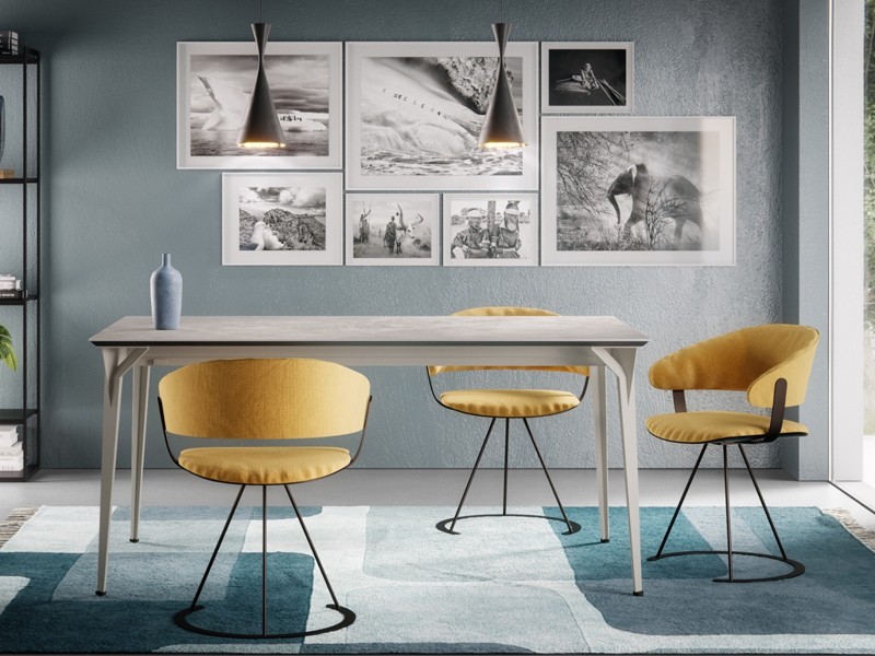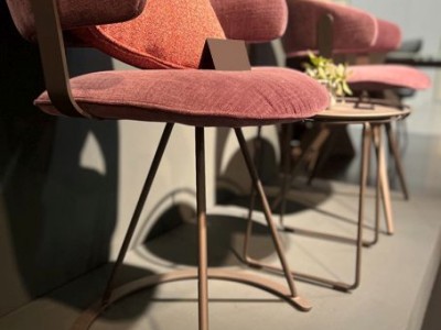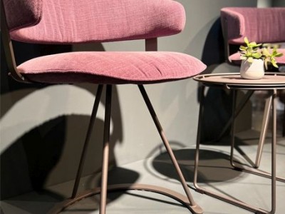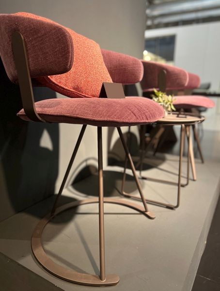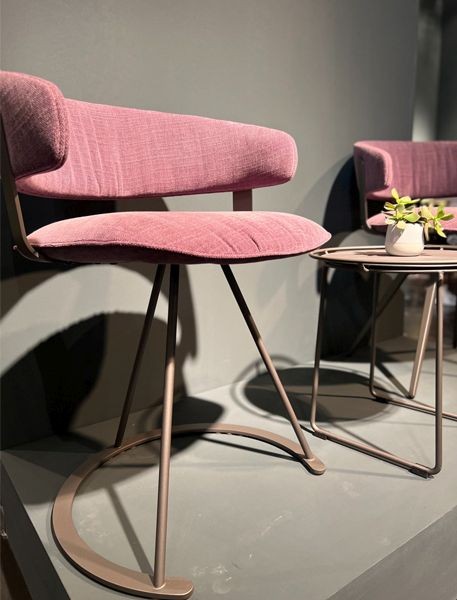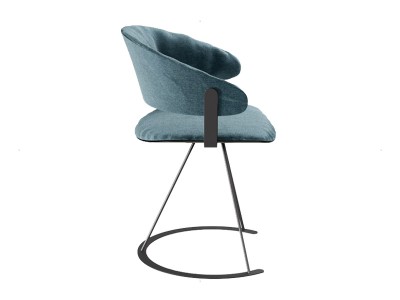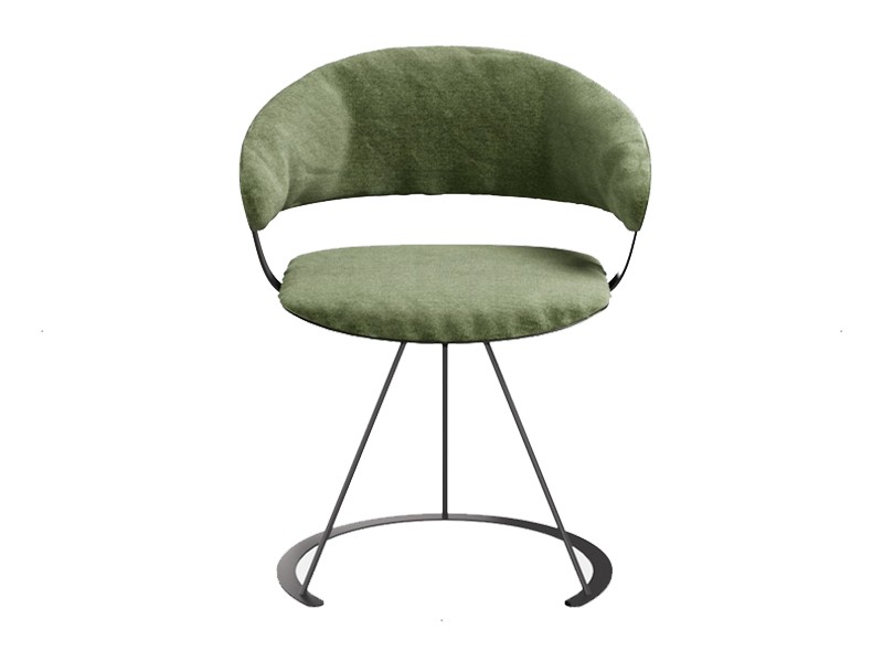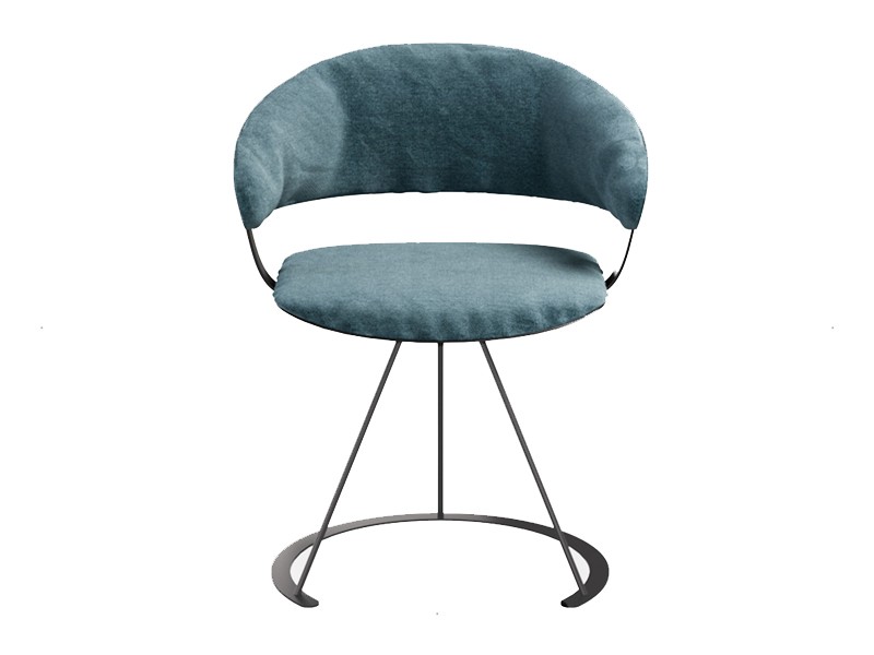 - Armchair with three leg steel frame, seat and back upholstered in fabric, available in different colors.