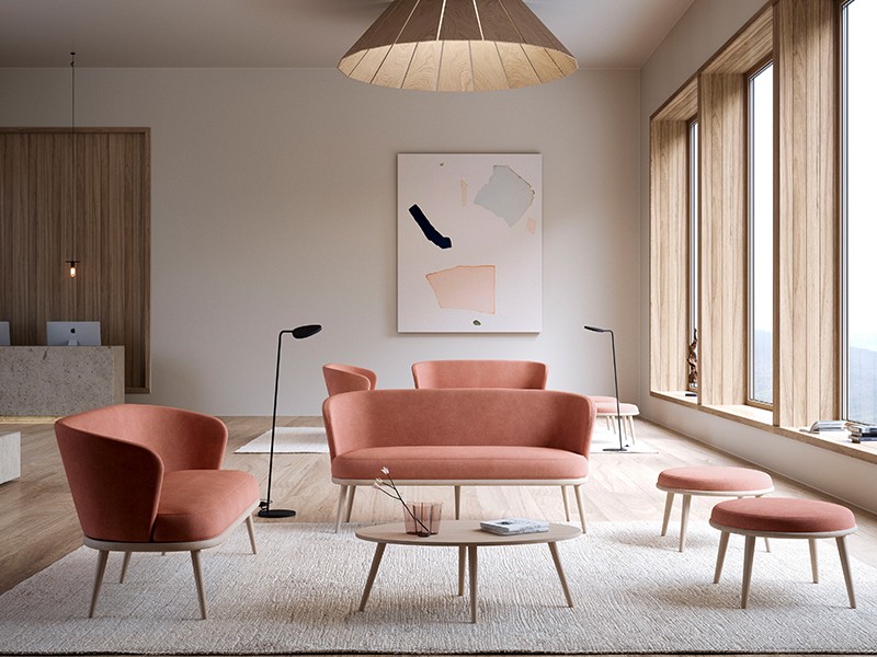 - Audrey Double is a stylish sofa made from beech wood, featuring elegantly curved armrests. Its design is contemporary, making it an excellent choice for horeca establishments such as restaurants, coffee houses, and various other markets.