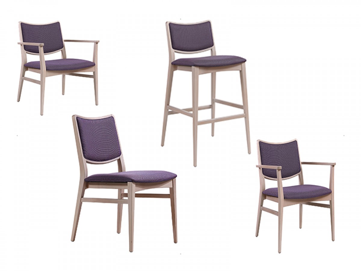 - The Spirit collection includes chair, armchair, barstool and lounge, with solid beech wood frame, seat and back in fabric or faux leather