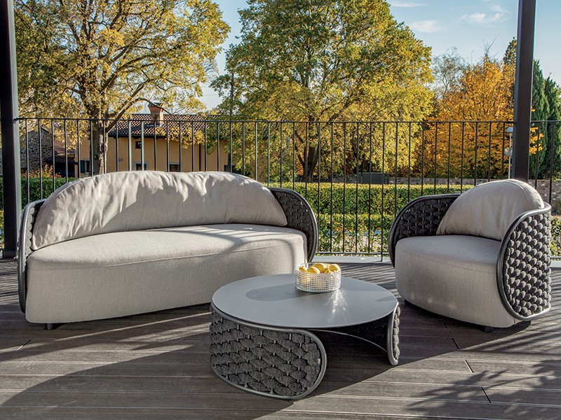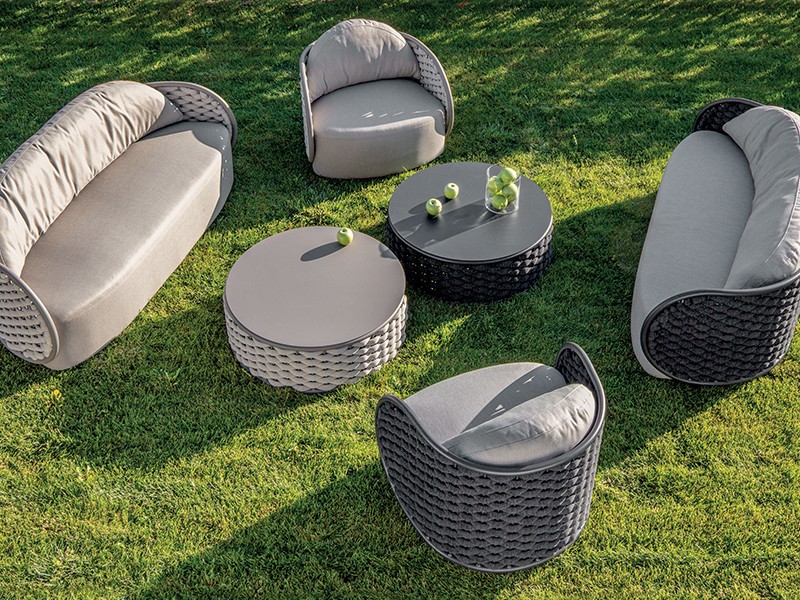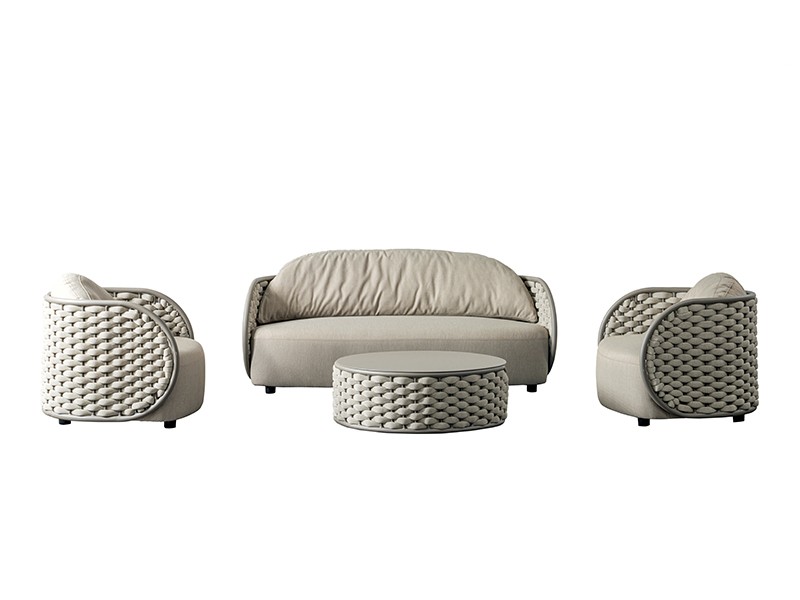 - The armchairs and sofa are elegantly covered with a combination of textylene and rubber rope, showcasing both durability and modern design.