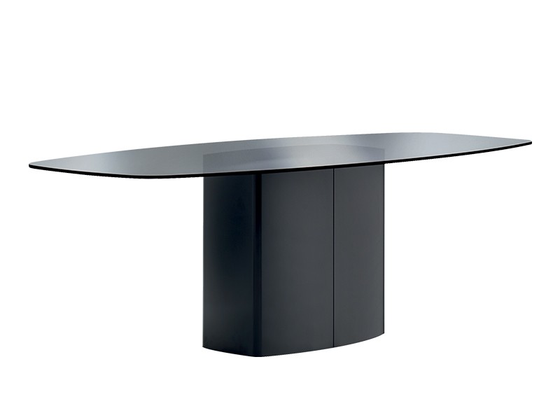 • The table showcases a steel cover, cleverly split into two shells, which conceals a central rectangular base with rounded corners.