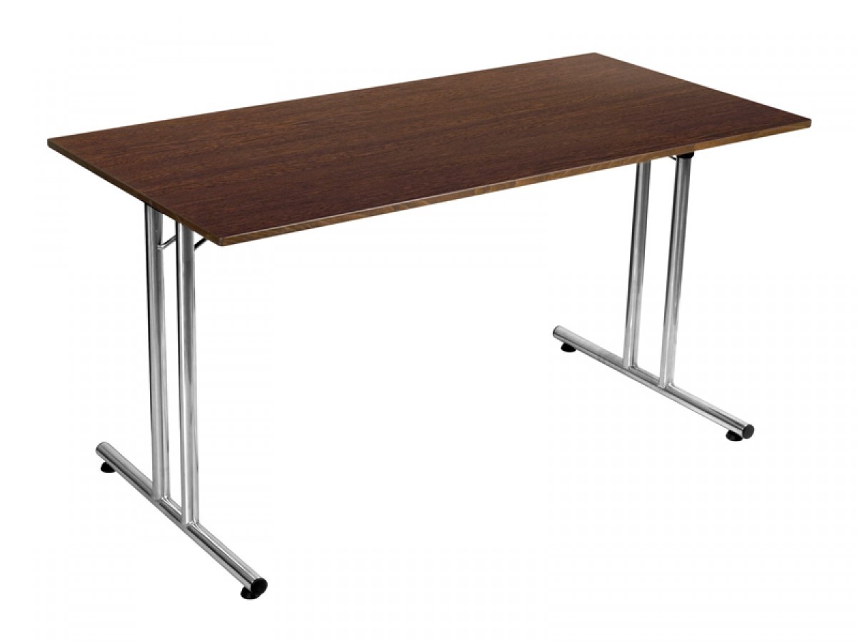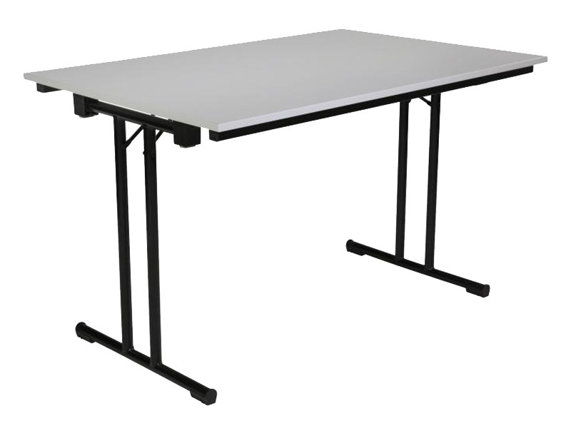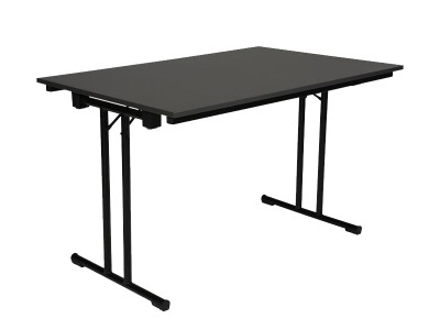- Folding table with melamine chipboard table top and epoxy black T-shaped steel frame.