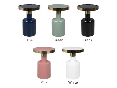 - Side table with enamelled steel top with powder coated border and enamelled iron base.