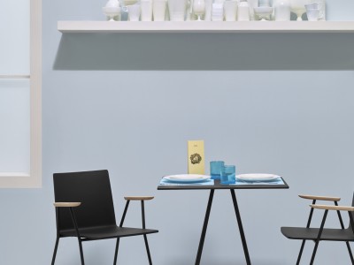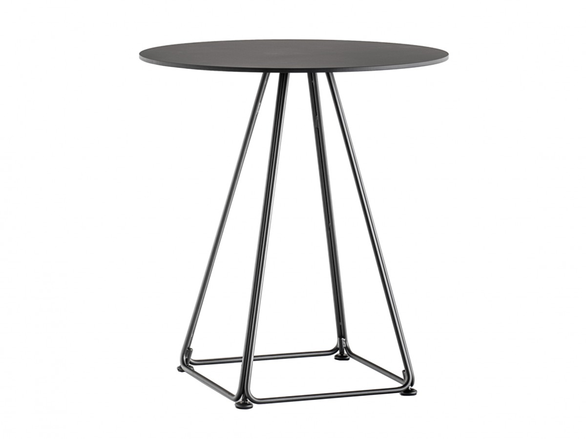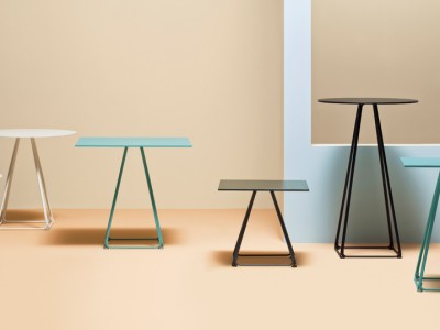 - The base consists of four trapezoidal steel rods and can be combined with tops of different sizes and finishes.