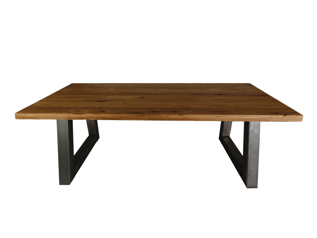 - The table top is made of planed rustic oak planks. The base is made of untreated steel. It is a very sturdy and stable frame in the shape of a trapezoid.