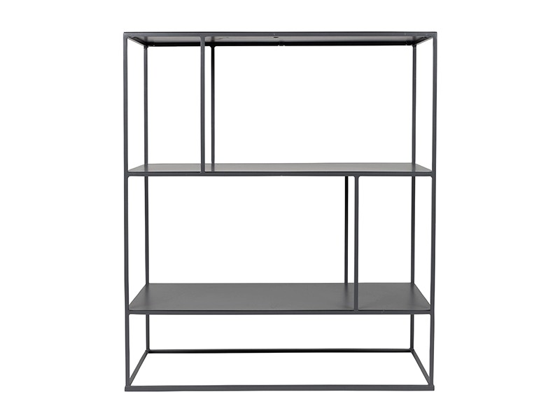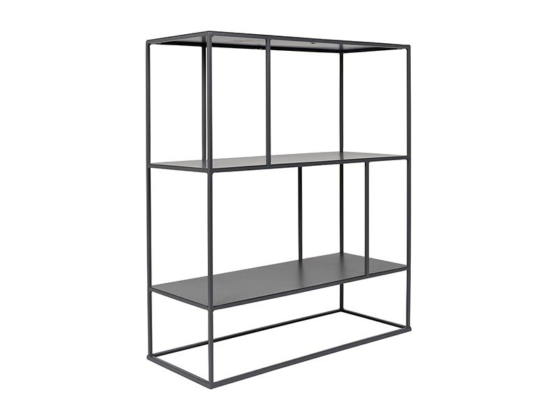 - Son features a slim, open, metal frame with shelves that can be arranged in a low setting or stacked.